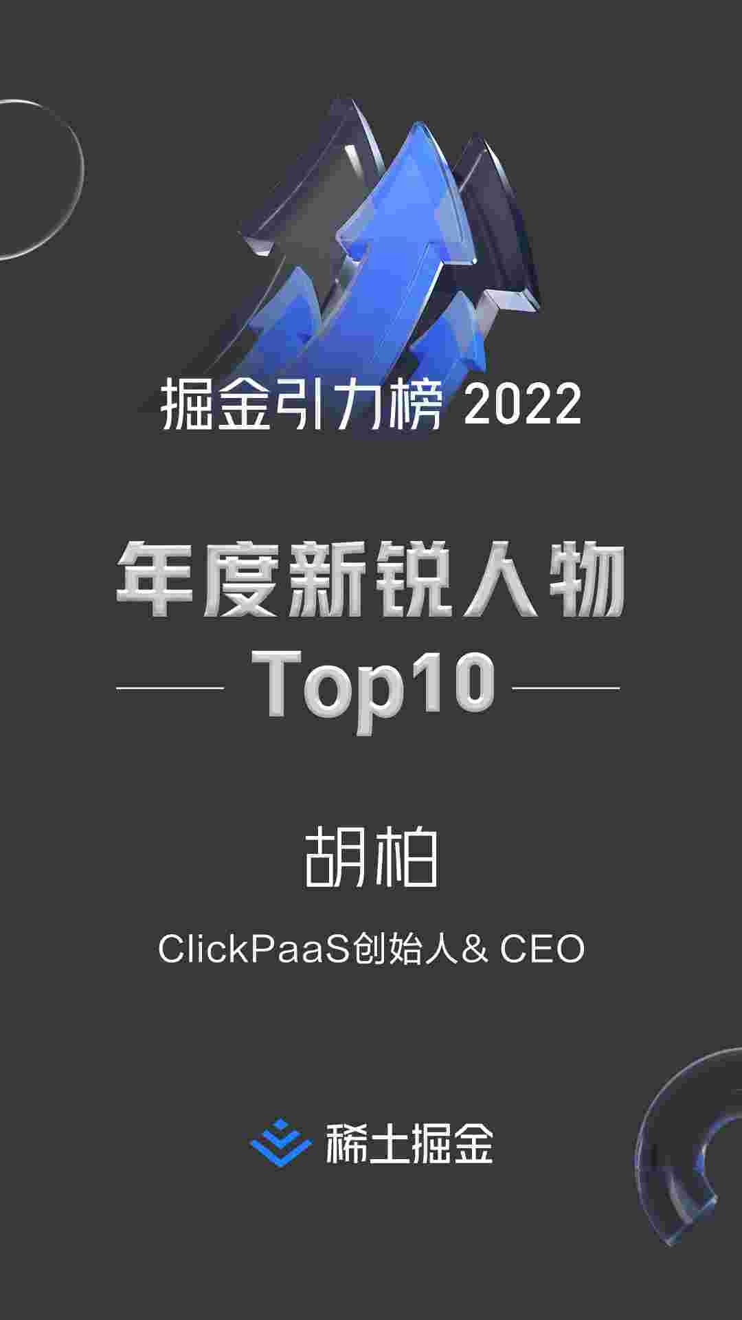 2022年1月6日,,,,,稀土掘金社区第一届「掘金未来大会」成功举办,,,,,,,,会上发布了“2022 稀土掘金引力榜 年度新锐人物”榜单,,,,,,,,,,上海爱湃斯科技有限公司(简称小米钱包)创始人及CEO胡柏实力入选年度新锐人物TOP 10。。。。。。